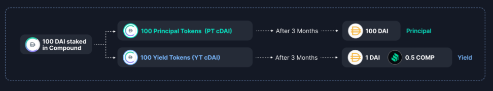 通过 Pendle,可以将生息资产 cDAI,拆分为 PT-cDAI 和 YT-cDAI,PT 代表本金 100 DAI,YT 则代表 3 个月产生的收益,1DAI+0.5 COMP。