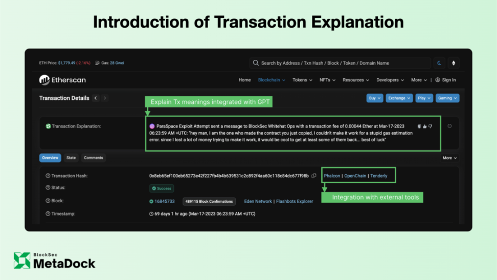 过往,MetaDock 提供了大量的独家风险信息和实用功能快捷入口,用于增强 Etherscan 等区块链浏览器的可用性。而融入 GPT 之后,MetaDock 则还可以用“说人话”的方式,将这笔交易的关键内容“讲”给你听。