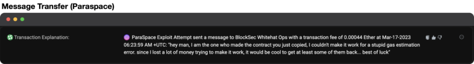 今年 3 月 17 日,黑客发起了对 ParaSpace 的攻击,被 BlockSec 团队成功抢跑拦截,价值超 500 万美元的数字资产获救。很多人听说失意的黑客在链上公开乞讨,却不知道是出自这条交易中夹带的消息。