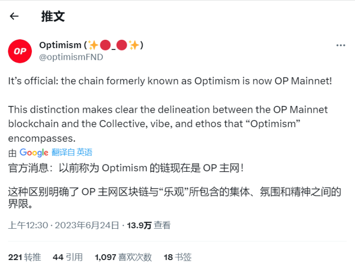 6 月 24 日,op 官方消息,Optimism 已更名为 OP Mainnet,此举主要反映了 op 想成为 L2 网络上“超级链”的愿景。