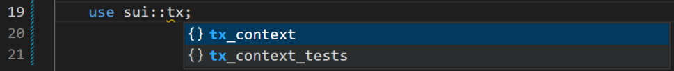在打字时,Sui Move Analyzer 会自动显示出 Move 中几乎所有建议的元素。由于它集成了 Sui Framework,在 IDE 中键入「sui::」即可显示一个可供选择的模块列表。