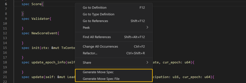 MSL 中的规范决定了 Sui Move 功能如何交互,Sui Move Analyzer 可以为单个函数或 .move 文件中的所有函数生成这些规范。