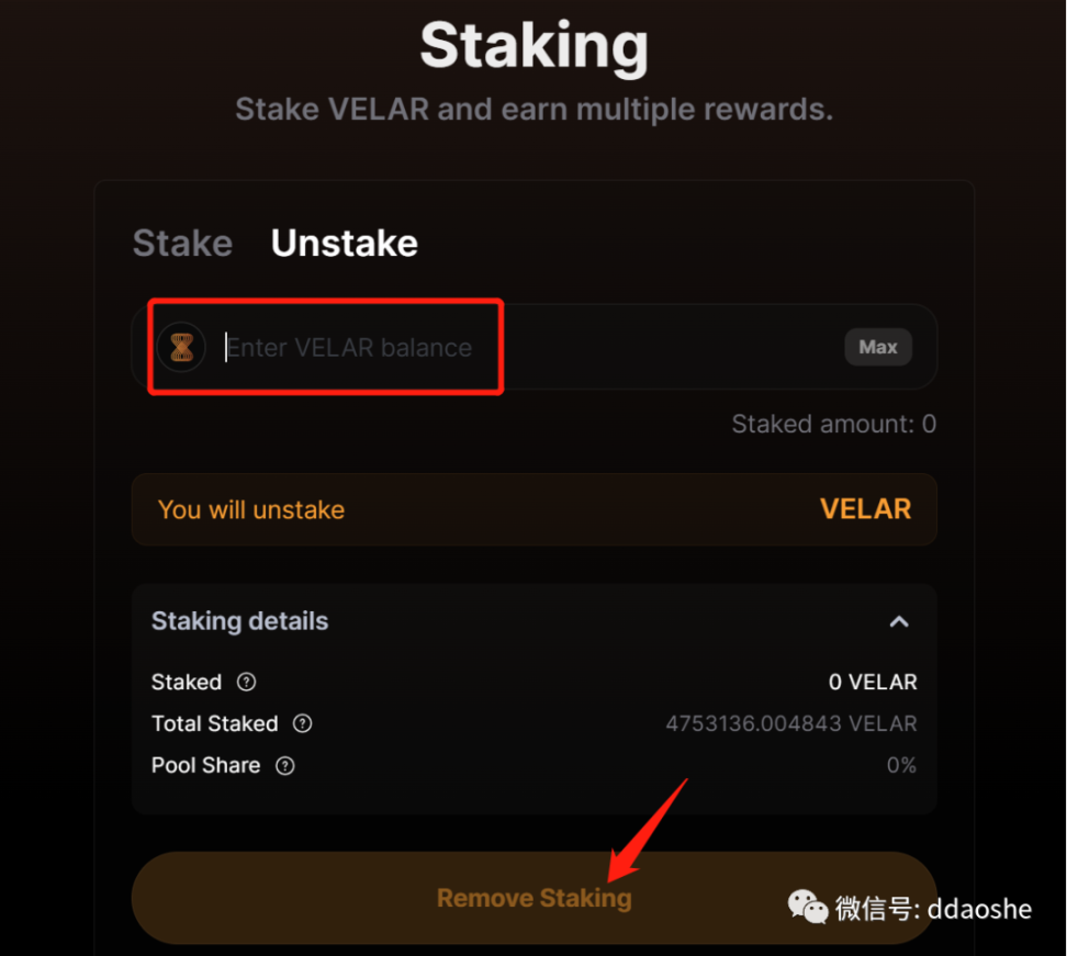 11 移除 stake,输入数量,直接点击 remove staking 即可
