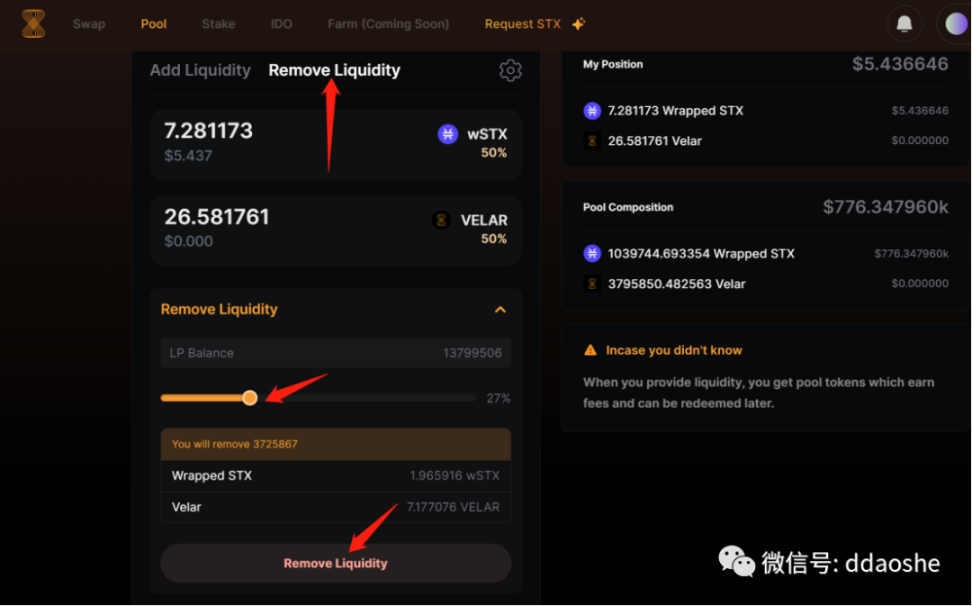9 移除 lp,点击 remove lp,选择移除的比例(不要全部移除),最后点击 remove lp