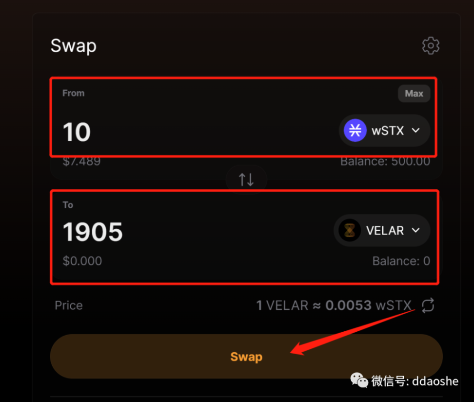 6 体验 swap,输入数量,将一定数量的 stx 兑换成 velar