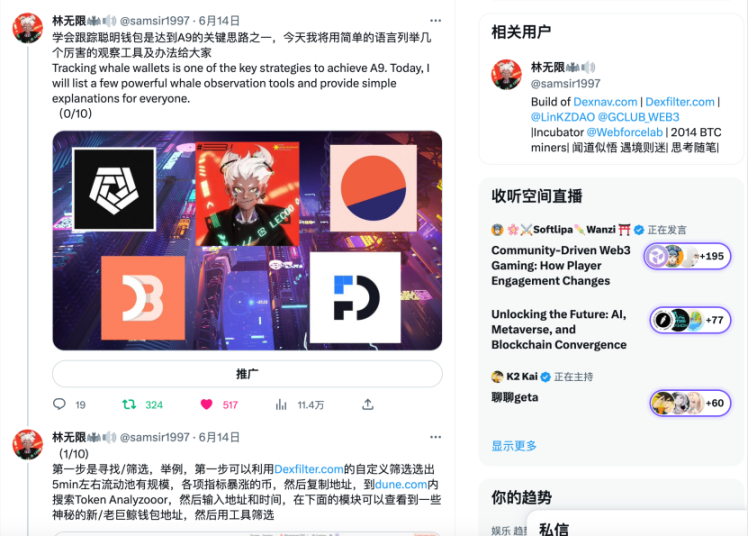 我们不止开发了工具平台,而是开发了大约四款,但推特一直没有很好地运营,客户一直都是在其余平台和渠道进行营销,现在我们主要提供一些技术和行业服务给交易员和各种Web3项目方,比如定制化的数据服务和撸毛服务,他们需要一些类似于沙丘那样的定制化数据,单纯沙丘并不能满足他们,链上数据在区块链行业里的地位是有重量的,通常是差之毫厘,失之千里,所以购买交易所的订单簿数据,爬取链上数据,高性能服务器,高速节点服务器这些都是基本的,难的保持稳定和技术实行逻辑的落地应用,我们自己产品现在的一级数据以及稳定性已经保持一年多没出什么大问题,除了维护,平时也都是免费开放给大家的,现在我们的平台主要是为交易客户提供私人定制服务,我们也会利用这些数据进行交易及资产管理,我不敢自称为专业量化,我们认为我只是处理交易方面的事情比较擅长而已。我们自己会使用平台的数据进行交易,并提供一些交易及其余方面的服务。目前主要依靠自然流和过往的积累,我个人就喜欢写写科普文章,如果有项目方需要找我合作,我也很乐意,小林希望和各位老板多学习。