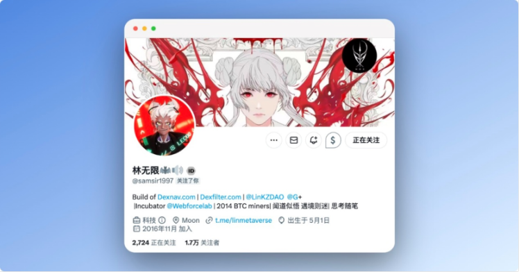 大家好,我是林无限 Sam,我目前是一位产品建设者和科普博主,致力于推动行业的发展,16 岁入行,一直以来都在幕后做事,这两三年想做产品,所以慢慢的用林无限这个假名开始在公众视野展现,我最早从矿机档口搬货小弟做起,文化不高,运气好入场早而已,最多持有过 1w 个 Bitcoin,不过都是很早期的事了,那时候的价格没现在那么高,所以收益也是很普通,并没大家想的那么有钱,我平常出门都穿拖鞋,搭地铁居多,现在就自己做一些产品凑合过生活,平时做一下科普博主,想尽可能吸引多一些新鲜血液加入,和大家一起共同建设行业。