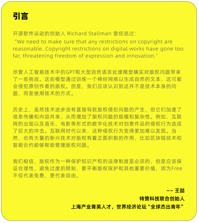 回归到 AI 场景,当我允许人去学习时,为何不允许 AI 学习呢?不过,这里会涉及到知识产权合理使用的限制,过于宽泛的援引合理使用也可能会侵犯到原作品人的权利和 TA 的市场价值。