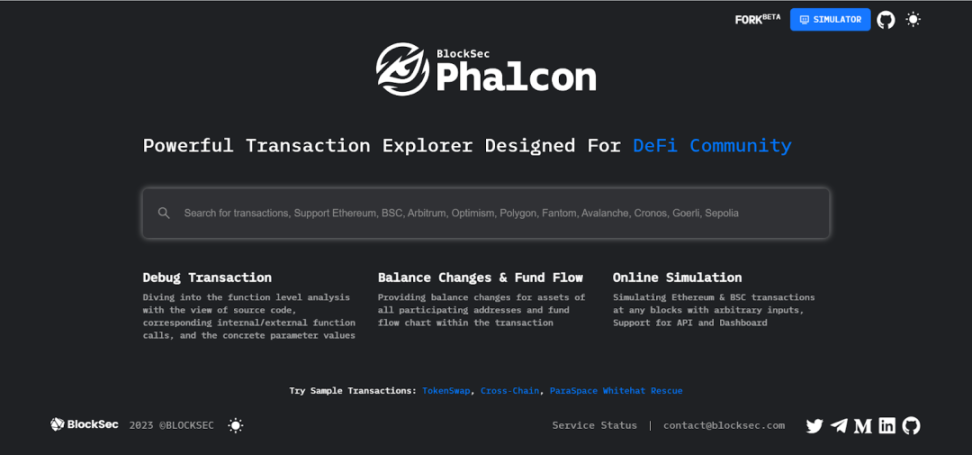 图源:BlockSec 官方Phalcon Explorer - 是一款强大的区块链交易浏览器,提供交易解析、模拟执行、Debug 等功能; Phalcon Fork - 是一款可在私有环境下部署与主网状态一致的安全测试平台,内嵌安全工具套件,帮助项目方进行安全初筛,同时支持团队协作和项目公测; Phalcon Block - 是一款主动威胁防御系统,提供监控、告警、阻断(暂停或抢跑)黑客攻击的独家能力,据悉,BlockSec 已成功拦截攻击并挽回资金超过 1400 万美元,是业界在主动防御领域唯一有成功实战案例的安全公司。