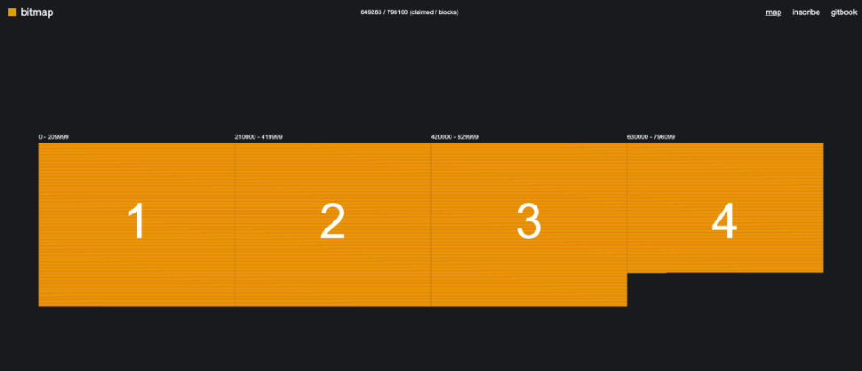下图为 Bitmap.land 官网(https://bitmap.land/),目前功能主要是呈现“元宇宙地图”。其将比特币区块按减半周期分为四大块(对应图中阿拉伯数字 1、2、3、4 所在的区域),放大后可以看到每个区块的编号及颜色,不同颜色代表售卖状态。