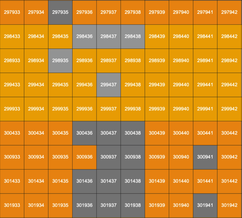 下图为 Bitmap.land 地图细部,图中数字为比特币区块编号,区块的不同颜色代表售卖状态。
