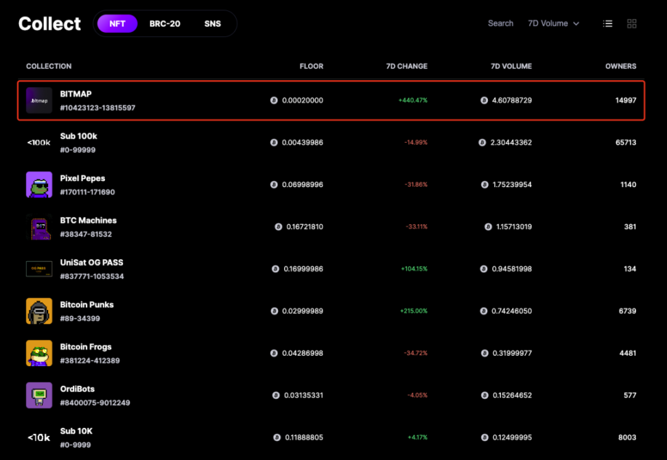 从比特币 NFT 大类的近 7 日销售排行来看,Bitmap 居首位。Bitmap.land 地板价为 0.0002BTC、7 日销售额为 4.6BTC、7 日销售额增幅 440%,数据上比较漂亮,显然也有相当的 fomo 情绪。