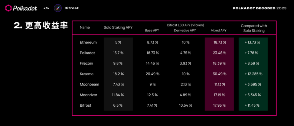 比如这里引用一张 Bifrost 在 Polkadot Decoded 演讲时的对比图。