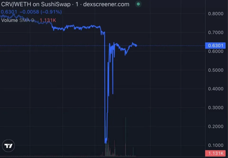 为了更详细地了解这一事件始末及其造成的影响,以下是我们对该事件更为详细的梳理。7 月 30 日,Peck Shield 检测到 NFT 借贷协议 JPEG'd 疑似被攻击, pETH-ETH 、msETH-ETH、 alETH-ETH 池子遭受攻击。随后,Vyper 团队在 Twitter 上发布了公共服务公告,称 Vyper 编译器的 0.2.15、0.2.16 和 0.3.0 版本存在漏洞,导致重入锁(reentrancy lock)的失效,并敦促“依赖这些版本的项目立即与我们联系”。多个去中心化金融(DeFi)协议被攻击者利用这个漏洞进行了盗窃,受影响的协议包括:Curve 损失了 6100 万美元,AlchemixFi 损失了约 1300 万美元的资产,而 JPEG'd 则遭受了 1100 万美元的损失,MetronomeDAO 损失 160 万美元,Ellipsis Finance 损失 68,600 美元,Debridge Finance 损失约 24,600 美元。在攻击发生后,一些受害协议和白帽黑客采取了措施来减少损失和恢复资金,一些 MEV 机器人也利用了漏洞从攻击者手中夺回了一些资金,并将其返还给受害协议。据估计,这些努力将总损失从最初的 7000 多万美元降低到了约 5200 万美元。在事件发生后,一些 DeFi 项目决定从 Vyper 迁移到 Solidity,这是另一种用于以太坊智能合约的编程语言。一些项目也决定集成 Chainlink,一个去中心化的预言机网络,可以将区块链与链下数据和计算资源连接起来。受到攻击影响,CRV 在多个 DEX 上的交易价格出现了剧烈波动。根据 CoinGecko 的数据,Curve DAO 的 CRV 通证在事件发生后 15 小时内下跌了 24%,创下了接近 0.60 美元的低点。然而,来自 DexScreener 的数据显示,在这场戏剧性事件中,该通证在去中心化交易所的崩溃幅度高达 86%。在某一时刻,某 DEX 上 CRV /WETH 交易对出现极端价格。这无疑会影响其他与 Curve Finance 相关或依赖的 DeFi 协议,例如 Yearn Finance、Synthetix、Aave 等,这些协议可能会面临资金流出、收益下降、通证贬值等问题。如果采用这一剧烈波动且失衡的价格,将会触发大量用户的清算条件,这样一来,这些用户不仅失去了他们提供给流动池的资金,还失去了他们用作抵押品的资产。且如果被清算,由于 CRV 的链上流动性已然不足,这就可能会给 Aave 和其他借贷协议造成坏账威胁。整个 DeFi 世界面临着一次巨大的考验,DeFi 贷方的应对措施是从 Aave 和其他协议中撤回资金,并在此过程中提高了借贷费用。Aave 的 USDC 池利用率接近 93%,导致贷款利率高达 22.4%;USDT 的利用率也达到 89.5%,借款人支付的利息接近 38%。同时,我们也在这次事件中清晰地认识到 Chainlink 在行业领域的采用幸运地避免了不良态势的蔓延。