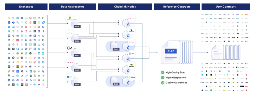 Chainlink 是一个将区块链智能合约与链外数据和计算资源连接起来的去中心化预言机网络,其可以通过提供去中心化数据源、可验证的随机源、自动化和跨区块链互操作性,帮助 DeFi 项目增强安全性和可靠性。我们可以想象一下,在这次事件中,如果 Curve 的 CRV/ETH 池被用作整个行业的链上价格预言机,而不是 Chainlink 的价格源(汇总各个中心化和去中心化交易所的定价),情况会有多么糟糕。对此,Chainlink 的社区大使在推特上表示“如果 Aave v2 或其他 DeFi 借贷协议使用(现已耗尽的)CRV/ETH Curve 池作为链上预言机,他们就会完全陷入坏账困境。” “想想都觉得可怕。”那么,Chainlink 的喂价机制到底是怎样的呢?其所代表的去中心化预言机对于 DeFi 来说到底具有怎样的意义呢?Chainlink 的预言机网络由多个独立的节点运营商组成,每个节点运营商都是经过严格筛选和验证的专业团队。这些节点运营商从多个不同的数据源收集并汇总价格数据,然后通过安全的链下通信协议将价格数据传输到链上的参考合约中。参考合约是一种存储最新和历史价格数据的智能合约,DeFi 应用可以根据需要查询这些数据。Chainlink 保证其预言机服务的可靠性和安全性,主要有以下几个方面:- 多重数据源:Chainlink 不依赖于单一的数据源,而是从多个集中式和去中心化的交易所和数据提供商收集并汇总价格数据,从而提供一个更准确和全面的市场价格。这样可以避免单一点故障或操纵,从而保证价格的稳定和真实。