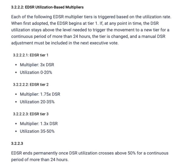 而根据此前 MakerDAO 社区对于 EDSR 数值的设计方案,EDSR 的增幅倍率会随着 DSR 利用率的四种不同情况而动态变化,具体如下: