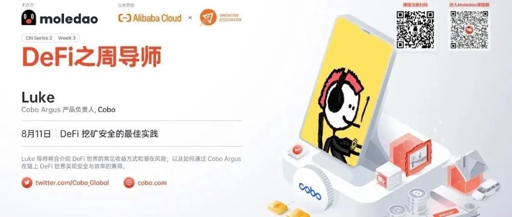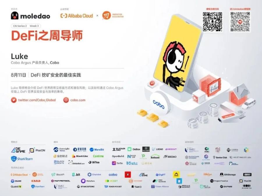 MoleEdu 公益课程是由 Moledao 携手 Alibaba Cloud 共同发起,涵盖加密学、隐私计算、DeFi、数字身份、DAO、安全合规等主题。Cobo Argus 产品负责人 Luke 受 Moledao 邀请,作为 DeFi 之周的导师于 8 月 11 日为 MoleEdu 学员带来《DeFi 挖矿安全的最佳实践》课程,以下是本次课程笔记速递。请点击左下角“阅读原文”,即可查阅“DeFi 之周”全部课程笔记。
