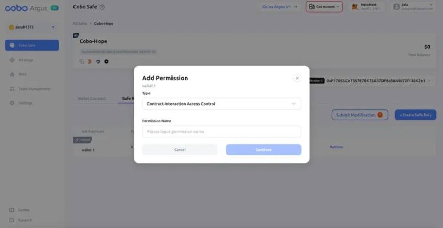 上述方案对资金存储是一个不错的选择,若对资产在冷钱包上进行其他操作会相对麻烦,想要加入操作便携性这一特性,解决方案为 Argus 授权单签。原理为将冷钱包特定 DeFi 操作权限授权到热钱包地址,热钱包可以进行授权范围内的操作。即使热钱包泄露,但是由于有权限的设置,整体来说也具有非常高的安全性。以下为 Argus 的授权界面。该方案可以保证有单签的灵活性以及多签的冷钱包的安全性。