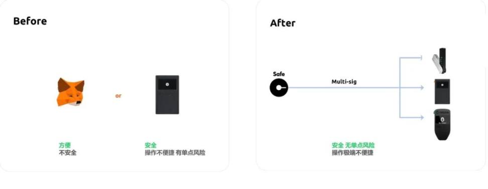 使用热钱包存在一定风险,而冷钱包非常安全,但缺点是使用不便捷,以及单点丢失风险。使用冷钱包多签便是一个很好的安全性方面方案。