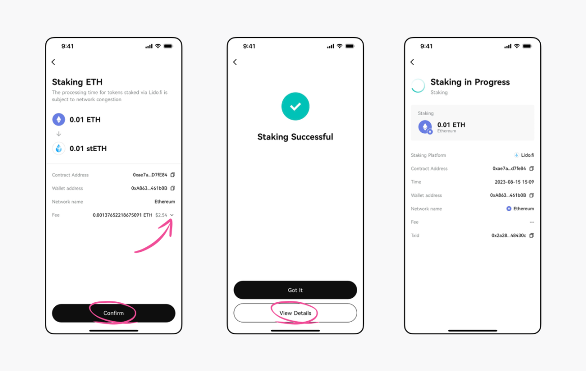 2)在该页面可通过点击 Gas 费数额处的箭头来调节 Gas 费的大小,调节后点击“Confirm”,输入交易密码,即可等待兑换为 stETH,成功质押。