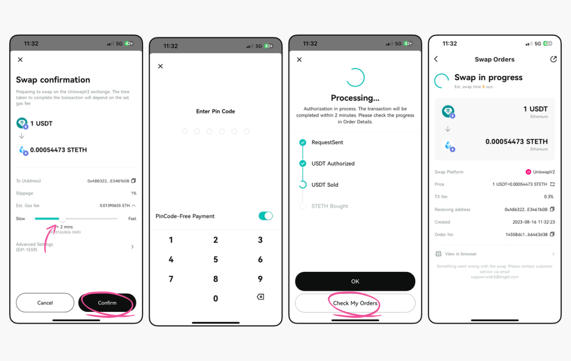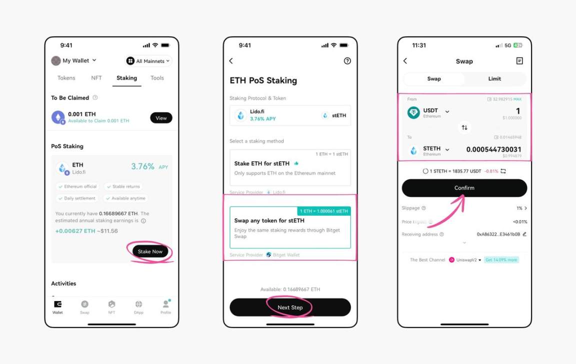 作为一直致力于回馈用户、提供优质加密资产交易服务的 Bitget Wallet,同时推出了最高可达 10% 的 ETH 稳定收益的质押活动!本次活动的质押收益中包括 4%-8% 的基础收益及 2%-6% 的收益补贴,同时免 Gas 费。用户仅需通过一键质押 ETH,就能以每日复利方式赚取稳定的 ETH 收益;也可以通过 Swap 将任意的币种一键兑换为 stETH 完成质押,非常便捷。
