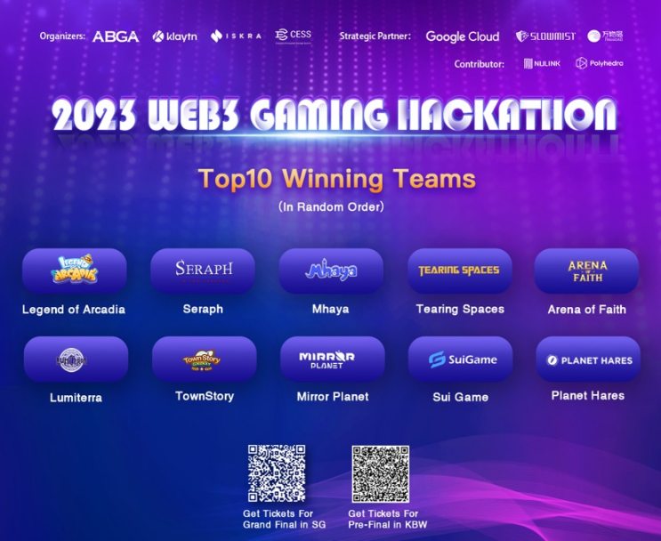 此次黑客松由 ABGA 联合 Klaytn,Iskra,CESS 共同主办,共有超过 90 家项目方报名申请,经过为期两个月赛程的激烈角逐,10 家来自 Web3 Gaming 及相关赛道的杰出团队最终脱颖而出。