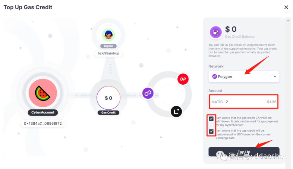 3 选择要充值 gas 的链,存入最低数量,然后点击 top up