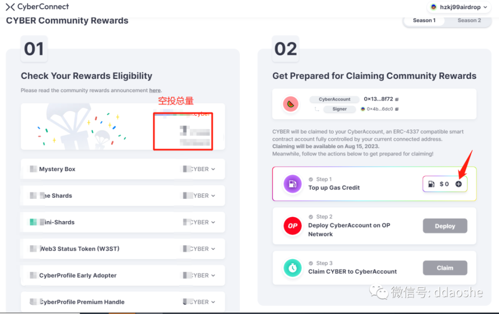 2 左侧可以看到自己的空投总量,然后点击右侧 step1 的加号