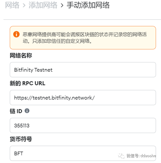 该项目得到了 Polychain Capital Beacon Fund、ParaFi Capital、Draft Ventures 等顶级加密 VCs 的支持。Bitfinity 当前还属于早期,测试网可用的 DApp 不多,而且营销方面似乎只侧重 ICP 社区。但是推出 EVM 的作用就是为了吸引更多的用户进入。Bitfinity 的治理令牌为 BFT(Bitfinity Token),总量 10 亿,发行在以太坊网络上,并可跨链至 IC 和 Bitfinity 网络上,目前该 EVM 生态不多,今天重点体验其网络第一个 swap。1 小狐狸添加 Bitfinity Testnet 测试网参数,并切换至 Bitfinity TestnetRPC URL:https://testnet.bitfinity.network/https://explorer.bitfinity.network/