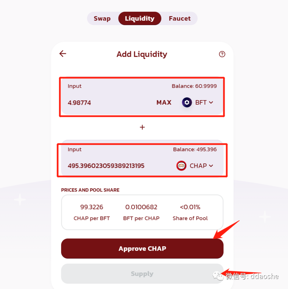 7 选择要添加的 lp 交易对,以 bft 和 chap 为例,首先授权 chap,完成后点击 supply 即可