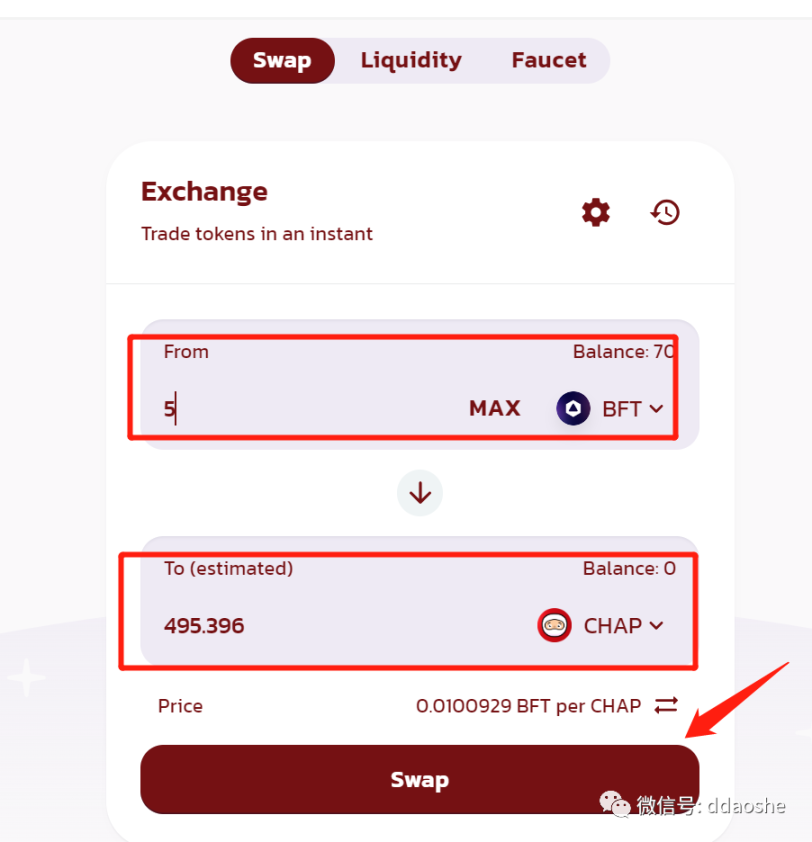 5 体验 swap 功能,将部分 bft 兑换为 chap,完成后也可以体验一下将 bft 兑换为其他 token 的功能,用以增加链上活跃记录,如果兑换失败需要多尝试几次