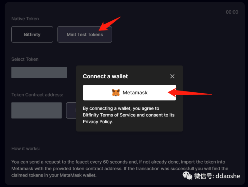 https://bitfinity.network/faucet点击 mint test tokens 弹窗链接小狐狸钱包