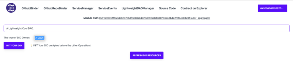 在 Manager 内连接钱包后,确认 DID Owner 为 DAO 类型,键入 Description,点击 INIT YOUR DID按钮,就可以对 DID 进行初始化。
