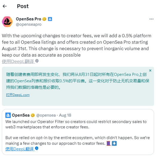 OpenSea Pro 将从 8 月 31 日起对所有挂单收取 0.5% 平台费用