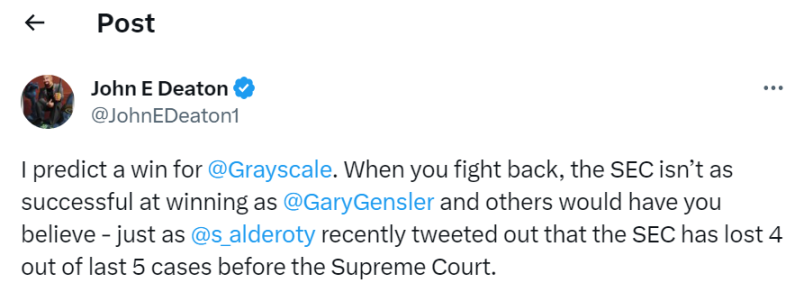 在灰度对 SEC 提起诉讼之后,Crypto 领域的律师 John Deaton 是最早预测该公司会战胜 SEC 的专家之一。