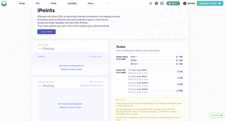 iPoint, in its full name “iZiSwap Point”, is a system introduced to measure users’ weight in receiving potential airdrop in the future. iZiSwap promises to share 50% of the token airdrop it receives from the whole Mantle ecosystem (including a series of events such as Mantle Journey’s 20M $MNT reward pool) in the future with all eligible users with “iPoints”.
