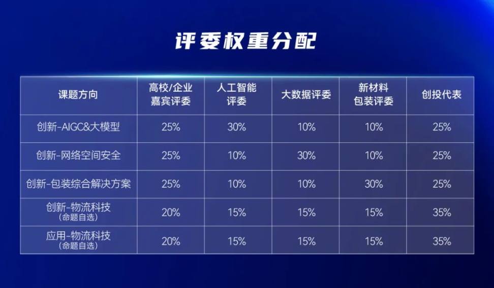 评审团组将结合参赛项目答辩情况实际,参照评分标准,通过评分系统独立开展项目打分。统分原则为:按行业评委权重比,折算平均分,按照各项目最终得分进行排名,其中:
