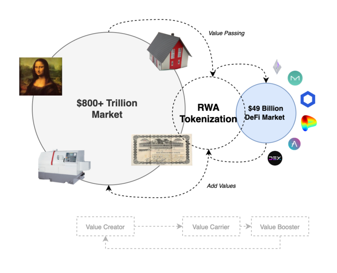 RWA 代币化为 DeFi 和传统金融创造了沟通和互动的方式,以满足不同的使用场景。RWA 的市值远远大于加密货币市场,这是因为 RWA 的代币化是将流动性重新引导到加密货币的强大催化剂,并且能够对抗去中心化经济的弱点。使用 RWA 作为抵押品是代币化的流行概念,资产发起人可以使用代币化的 RWA 在 DeFi 中借贷资本。不仅如此,用户还可以通过代币化转让底层资产的所有权或相关权利。在这一应用中,链上价值和释放流动性潜力是 RWA 代币化潜力的充分体现。