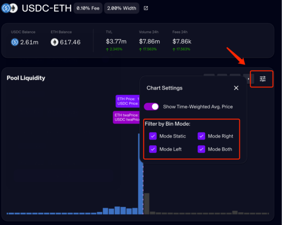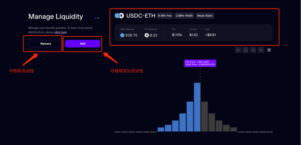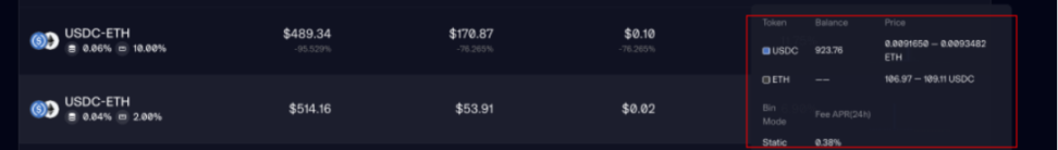 如图,该交易池在如果用户在红色标识区域内提供流动性,也就代表同意最低以 109USDC 的价格卖出 ETH。