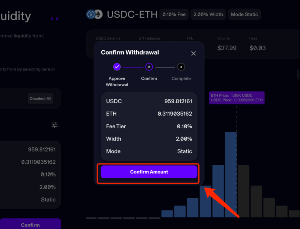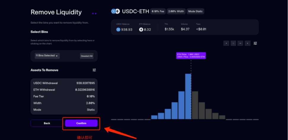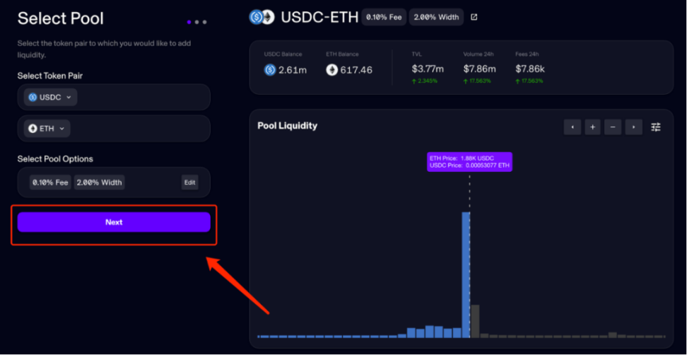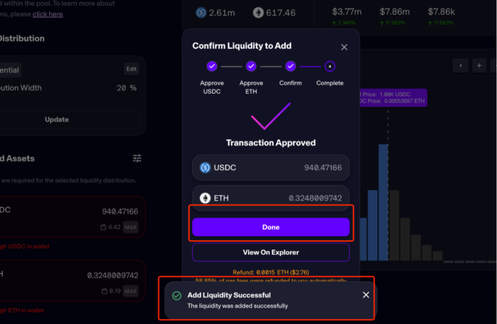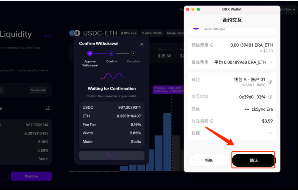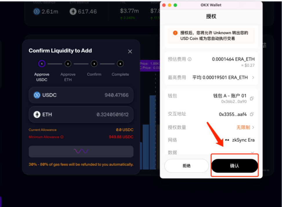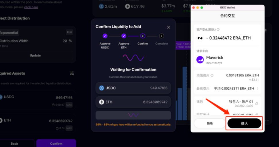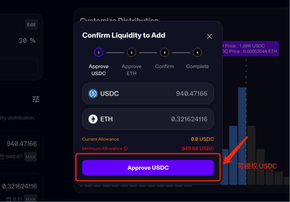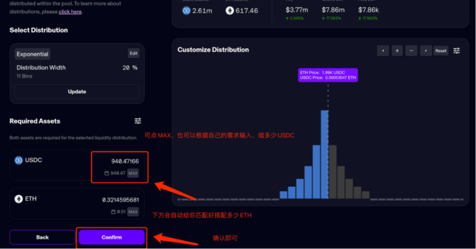 可输入 USDC 或点击 MAX 配置,自动匹配好 ETH,确定即可下一步。