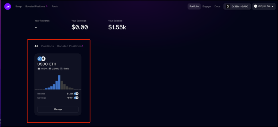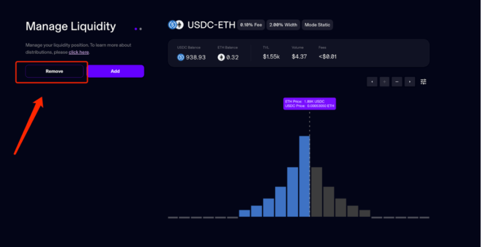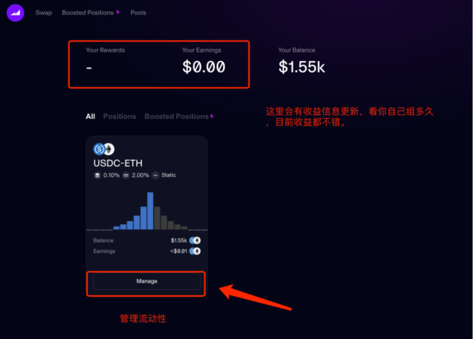 管理页面如图,有时候可能有点延迟,耐心等待即可出现下图内容,就可以对流动性进行管理操作,比如移除 LP。