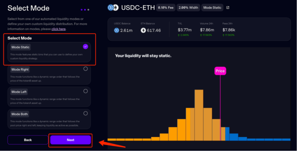 Maverick Protocol 为 LP 提供了四种流动性模式:Mode Left (向左)、Mode Right(向右)、Mode Both(双向)和 Mode Static ( 静态)。这里相较于 uni v2 和 v3 而言,在永久损失的分析和人判断上要格外注意。以 Mode Both 为例,在 Maverick 上,使用 Mode Both 出现永久损失(磨损)的可能性大,尤其是在价格波动比较大的交易对上。