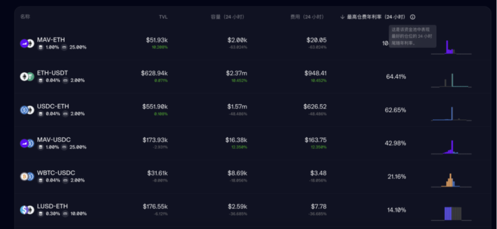 Maverick 上的新手用户经常容易将网页上显示的 APR 数据当做收益预期作为选择流动性池和头寸策略的参考。这里需要明确一点:Maverick 交互页面有明确注明该数据为该流动性性池中过去 24 小时表现最好的仓位的交易费年收益率,并且这里面没有将永久损失(磨损)或者无偿损失算在内。