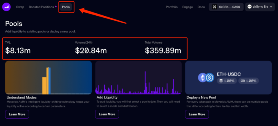以 zkSync Era 为例,进入 Pools 页面,可以看到项目的 TVL 为 $8.13m,24 小时交易量为 20.84m,总交易量 359.89m。