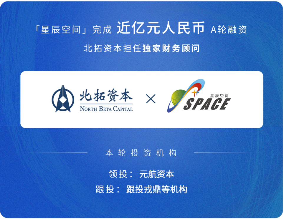 近日,北京星辰空间科技有限公司完成了近亿元人民币 A 轮融资,由元航资本领投,戎鼎资本等多家机构跟投。北拓资本担任独家财务顾问。