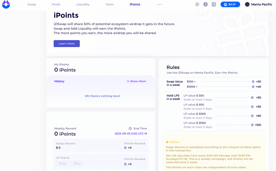 iPoint, in its full name “iZiSwap Point”, is a system introduced to measure users’ weight in receiving potential airdrop in the future. iZiSwap promises to share 50% of the token airdrop it receives from the whole Manta ecosystem in the future with all eligible users with “iPoints”. iPoints will be used to determine the weight of airdrop every eligible address shall receive. In brief, the more iPoints an address has, the more airdrop it will receive.