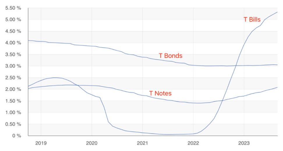 现在,短期债(T Bills,小于 1 年期)利率飙到了 5.319%,中期债(T Notes,2-10 年期)2.077%,长期债(T Bonds,20-30 年期)3.045%。