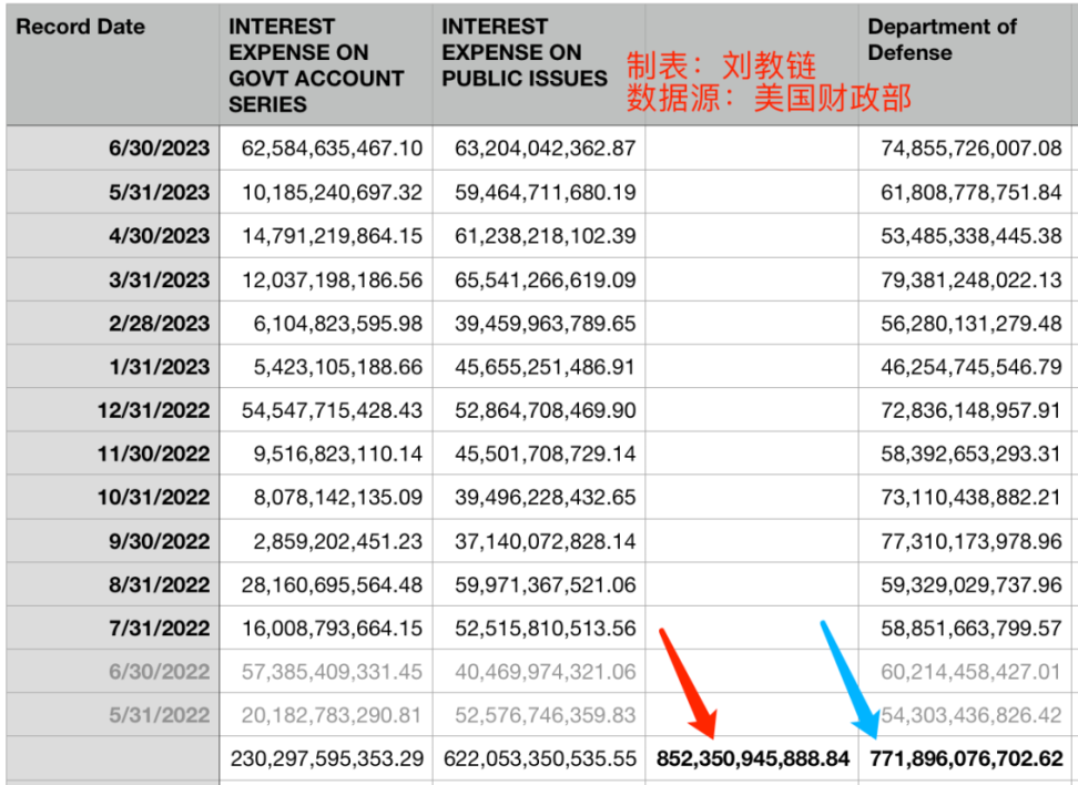 为什么耶伦 7 月份急得来我们这儿了?看一下美国财政部的数据,从 2022.7 月到 2023.6 月,利息支出 8523.5 亿美元;同期,国防开支(军费)才 7718.96 亿美元。这还是在前些年近乎零息时大量借债的情况下的利息开支。等大量低息债到期,美联储还不降息,低息债逐步置换为高息债,这利息支出可是不敢想!