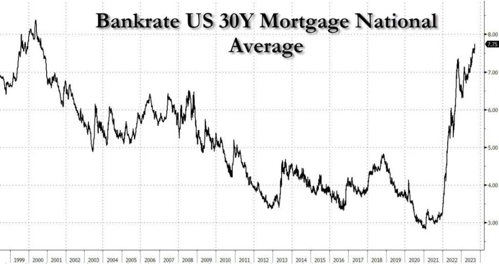 信用卡违约率持续上升。30 年期房贷利率已经飙升至 7.75%,严重打击了房地产市场。