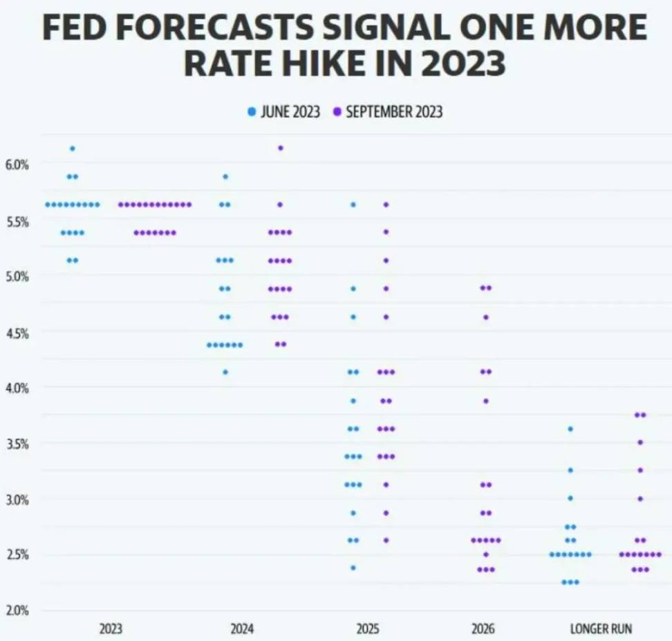 刚刚结束的美联储 9 月议息会议(9.19-20),做出了不加息的决议(维持 5.25-5.5% 不变),符合市场预期。但是,鲍威尔及其领导的美联储同僚们,继续挥舞加息大棒,恐吓市场:第一棒,今年仍然可能再次加息;第二棒,明年降息预期减弱,会更久维持高息。